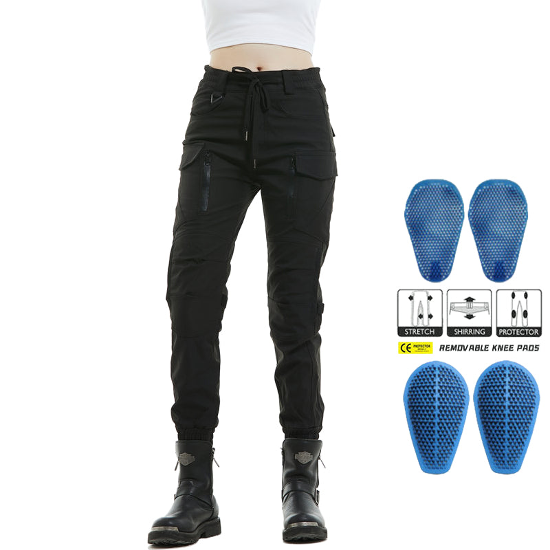 • Coussinets de protection des genoux et des hanches certifiés CE  Les genouillères et les hanches sont amovibles et faciles à monter. Insérez-les dans leurs poches spéciales pour une protection supplémentaire sur la route.