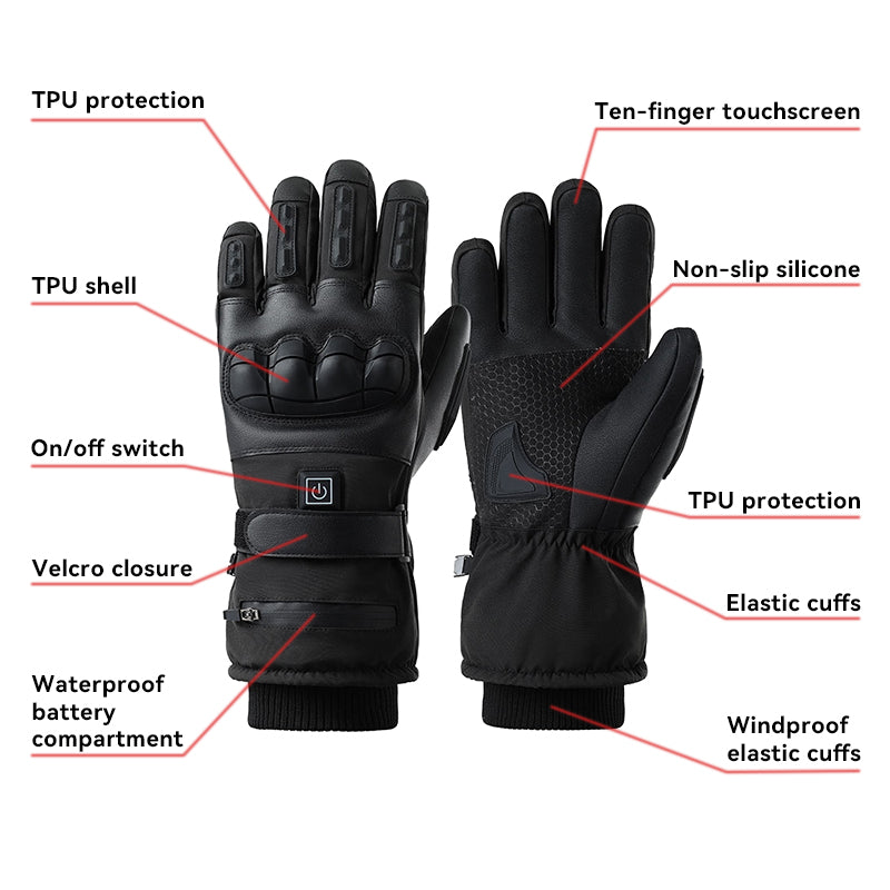 Features Water-repellent durable materials; electric heated gloves; touchscreen-friendly fingertips