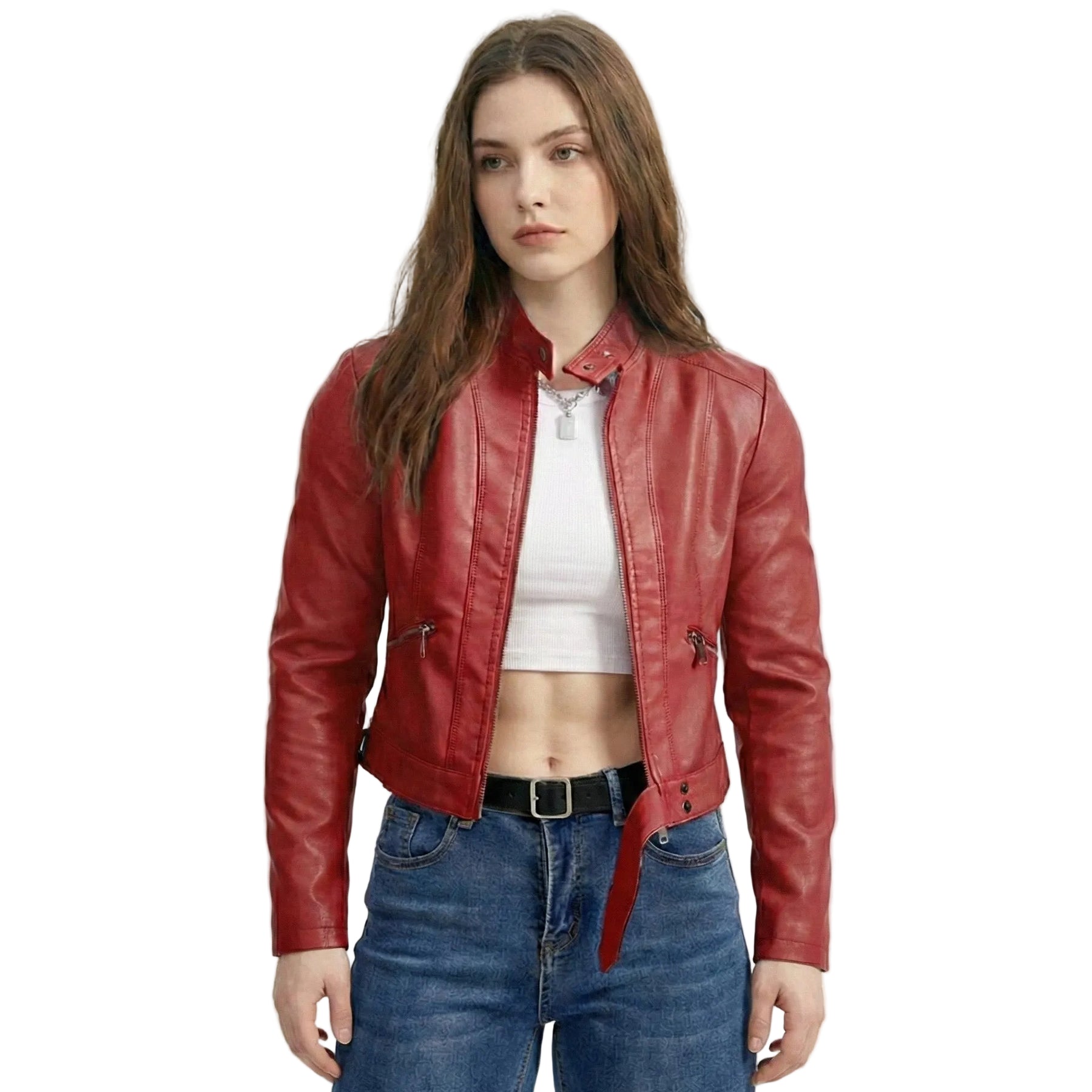 (Note: This jacket is a fashion-forward apparel piece inspired by moto-styling. It does not include built-in armor or slide-resistant lining.)
