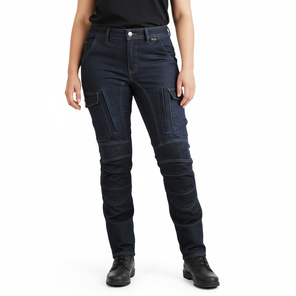 Women's K-2 Cordura Motorcycle Cargo Jeans enhance body protection while providing a breathable and comfortable ride. The outer shell combines mostly cotton with high-strength Cordura fabric to safeguard the lower body from various hazards. Reinforced with genuine Cordura® lining on the inside, the legs are protected from top to bottom. Removable CE knee and hip armor adds both full-range protection and a stylish statement.