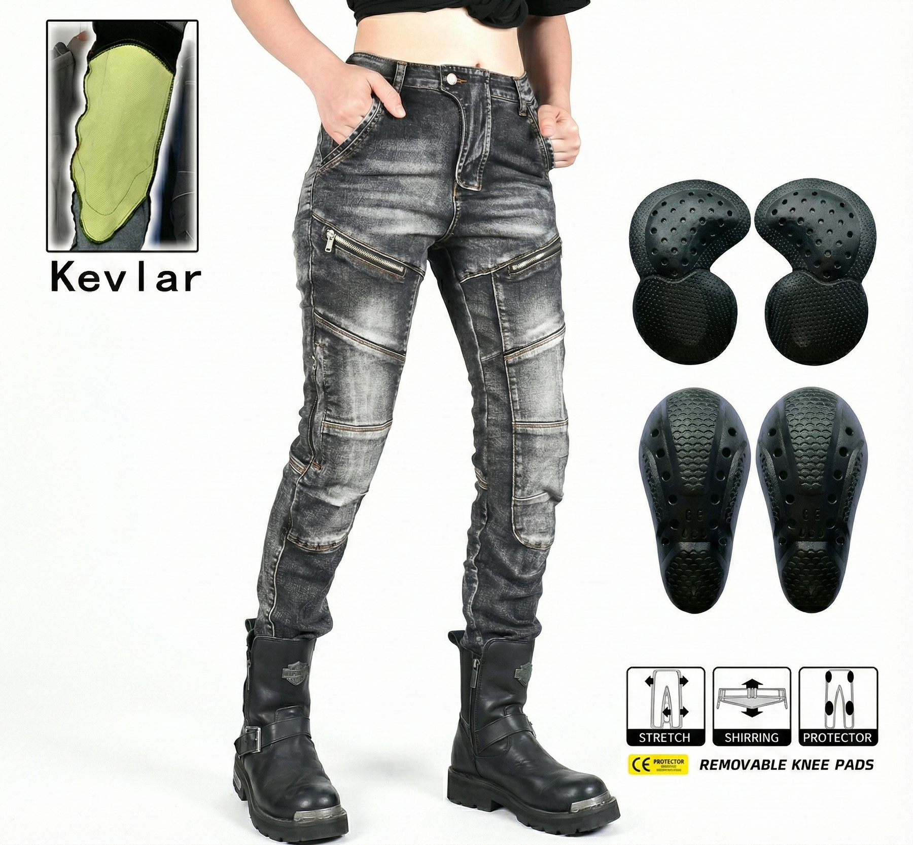 Built for the road, our Axis 21 Women’s Stretch Denim Motorcycle Riding Jeans deliver unbeatable protection without sacrificing style. Made from stretchable polyester-cotton blend with reinforced denim for superior tear-resistance, these jeans keep you safe while riding hard, all with a stylish, modern look.