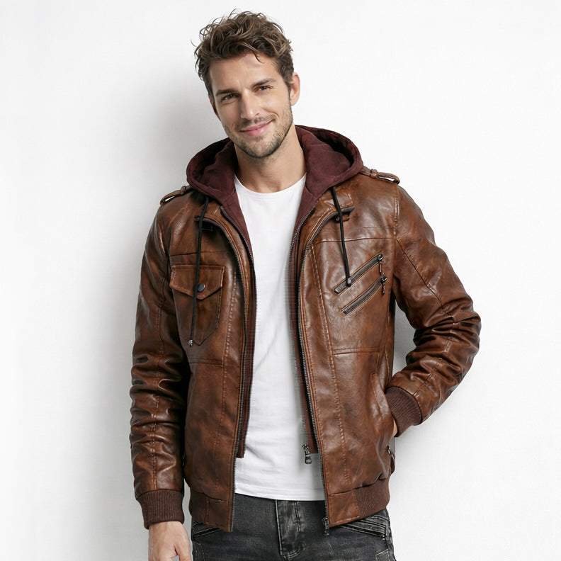 Découvrez notre veste de moto en cuir zippée sur le devant avec capuche : Si vous aimez les vestes en cuir, vous allez particulièrement adorer cette veste de moto classique en cuir zippée sur le devant ! C'est élégant, magnifique et extrêmement confortable.